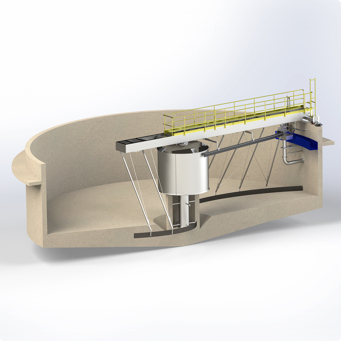 - Rynna uchylna wraz z pompą części pływających. Układ w pełni zautomatyzowany dający możliwość adaptacji da zrzutu części pływających raz na pełen obrót zgarniacza lub poprzez wykorzystanie sondy w dowolnym momencie gdy wykryty zostanie flotat. Rynna uchylna poprzez obrót zbiera części pływające odprowadza je do skrzynki zbiorczej z pompą która odprowadza je w zależności od wymagań do koryta obwodowego części pływających lub do centrum osadnika poprzez szczelne złącze obrotowe.